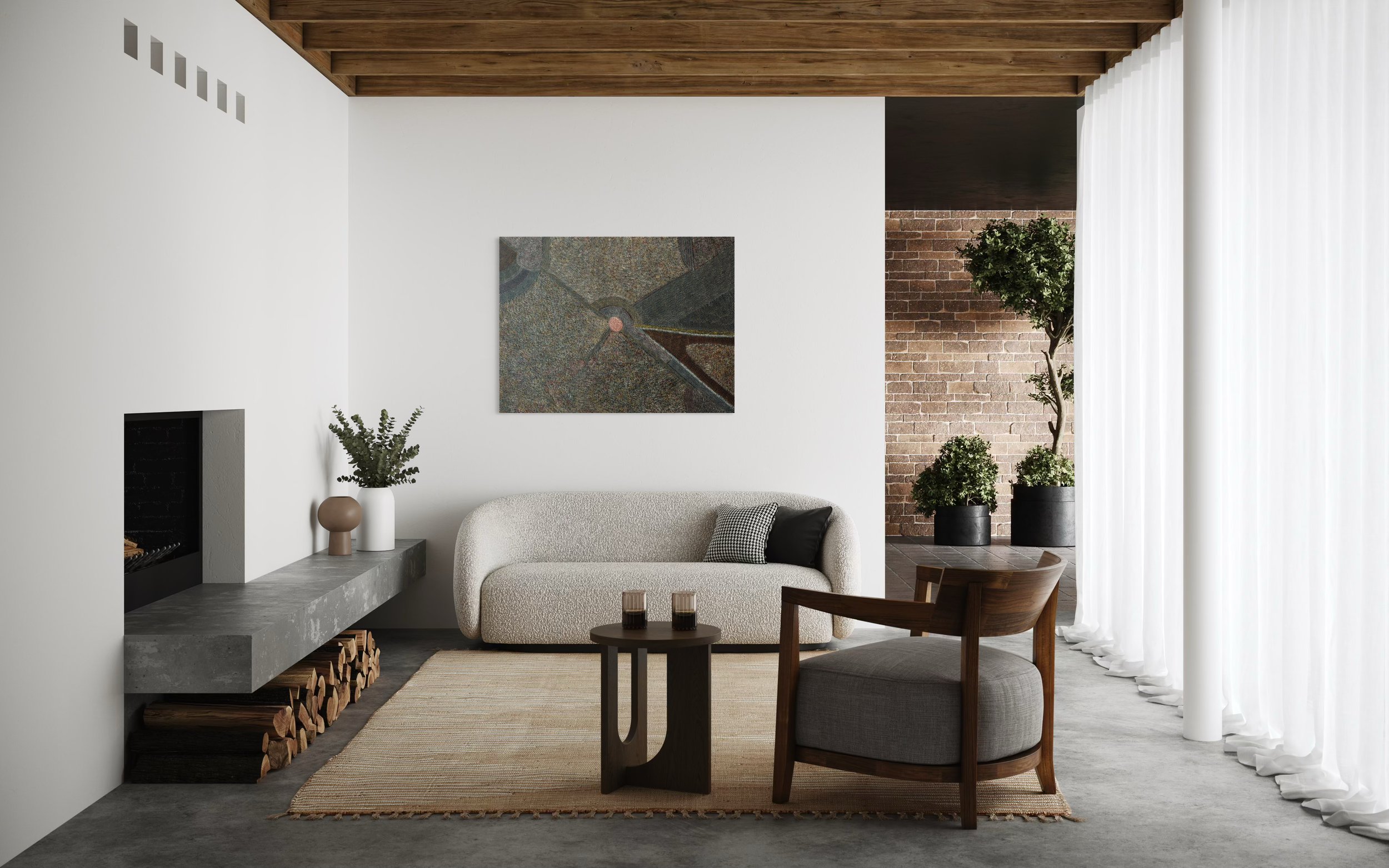 Œuvre d'Abie Loy Kemarre dans intérieur contemporain : ses compositions vibrantes s'intègrent magnifiquement dans espaces modernes. L'art aborigène d'Utopia apporte énergie, couleur et profondeur spirituelle tout en dialoguant avec design contemporain international. Conseil styling Inma Galerie.