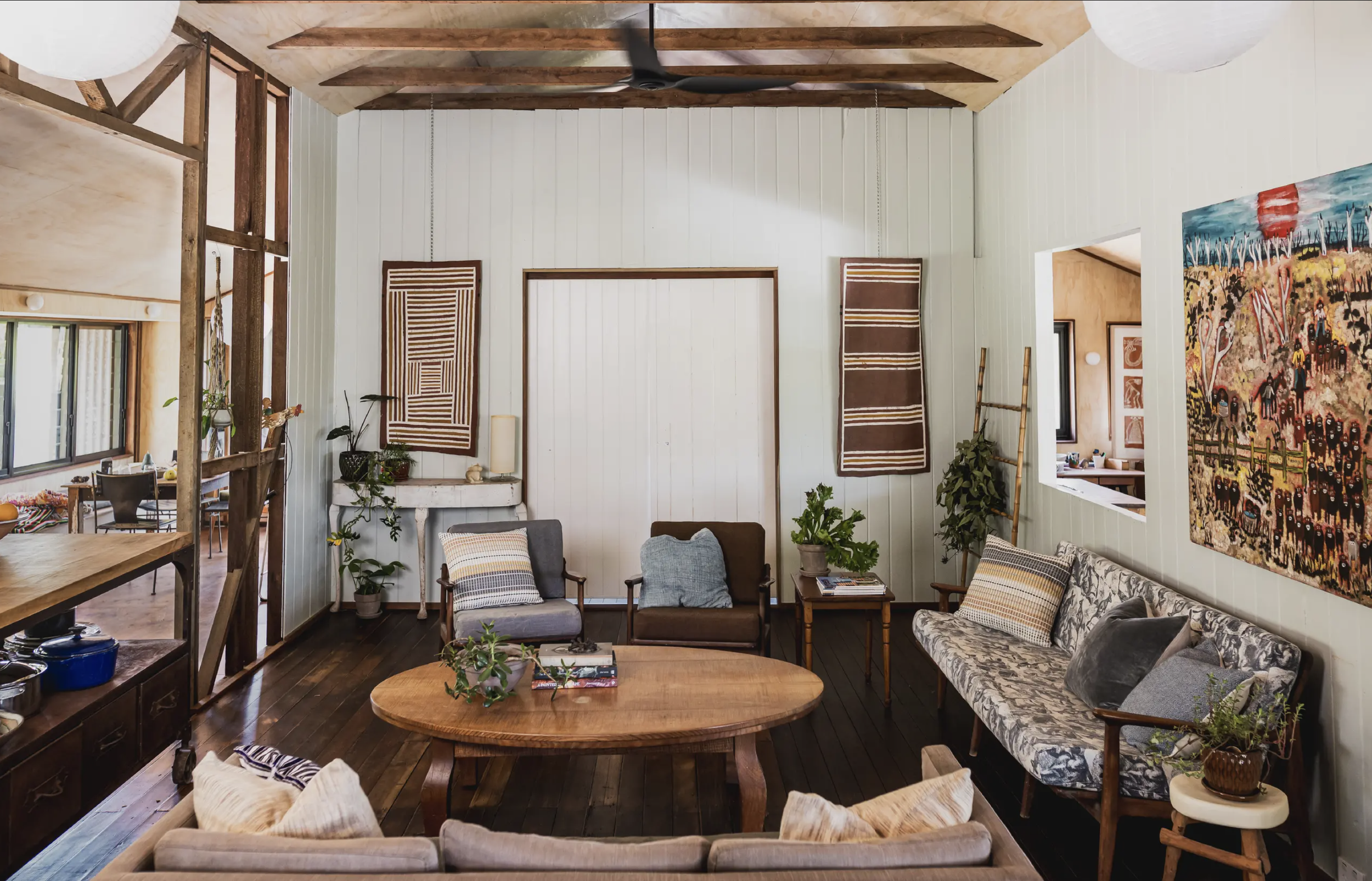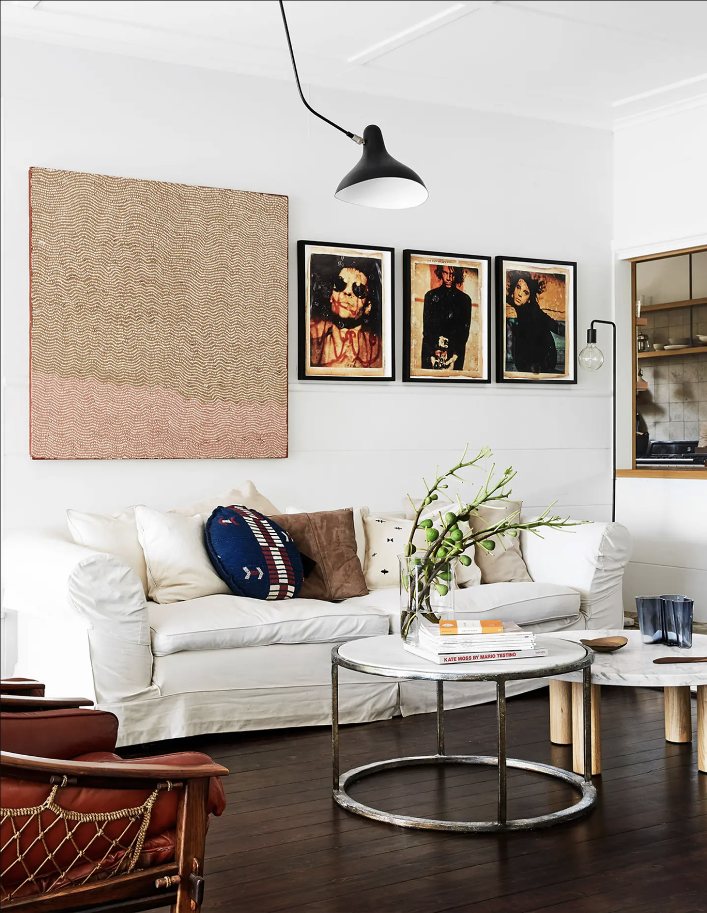 Dans ce coin salon, l'art aborigène crée une première impression marquante tout en conservant la sobriété architecturale.
