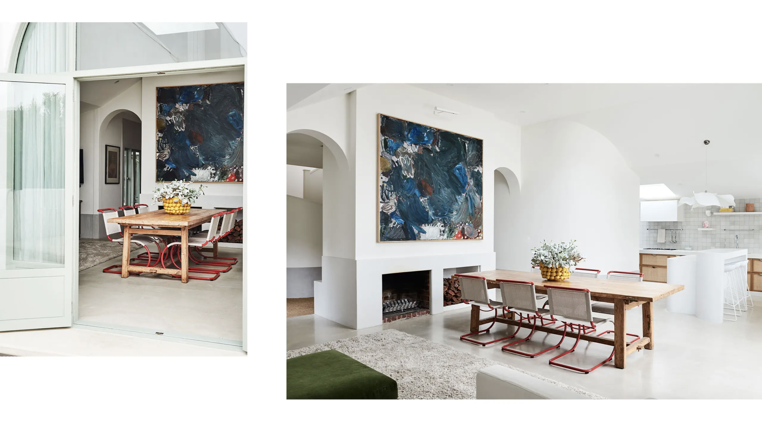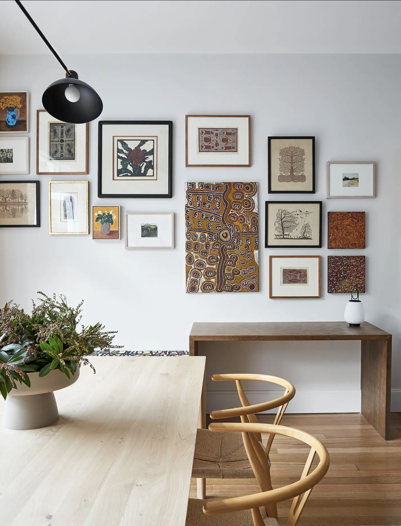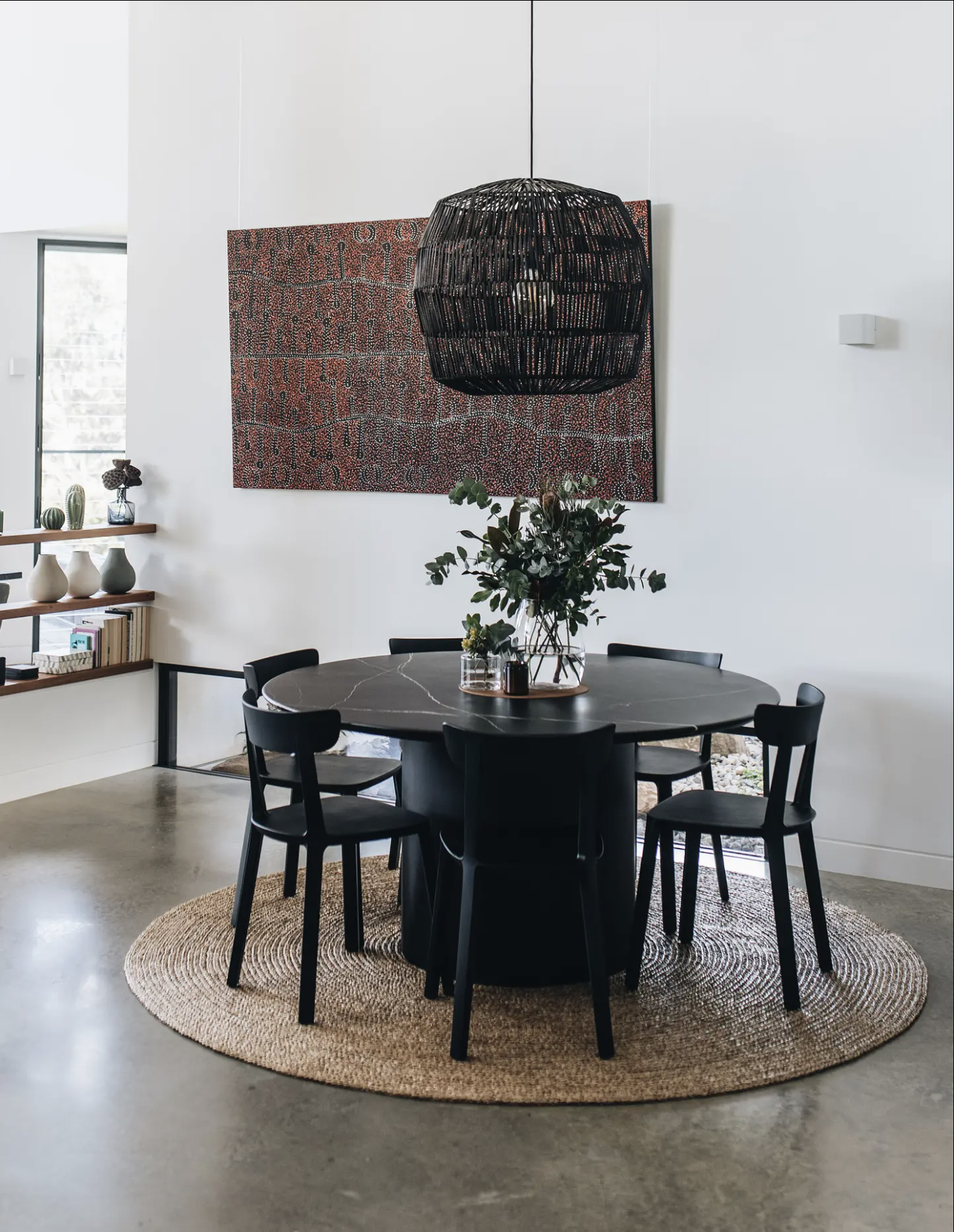 Dans cette salle à manger contemporaine, l'art aborigène crée un point focal chaleureux qui personnalise l'espace fonctionnel.