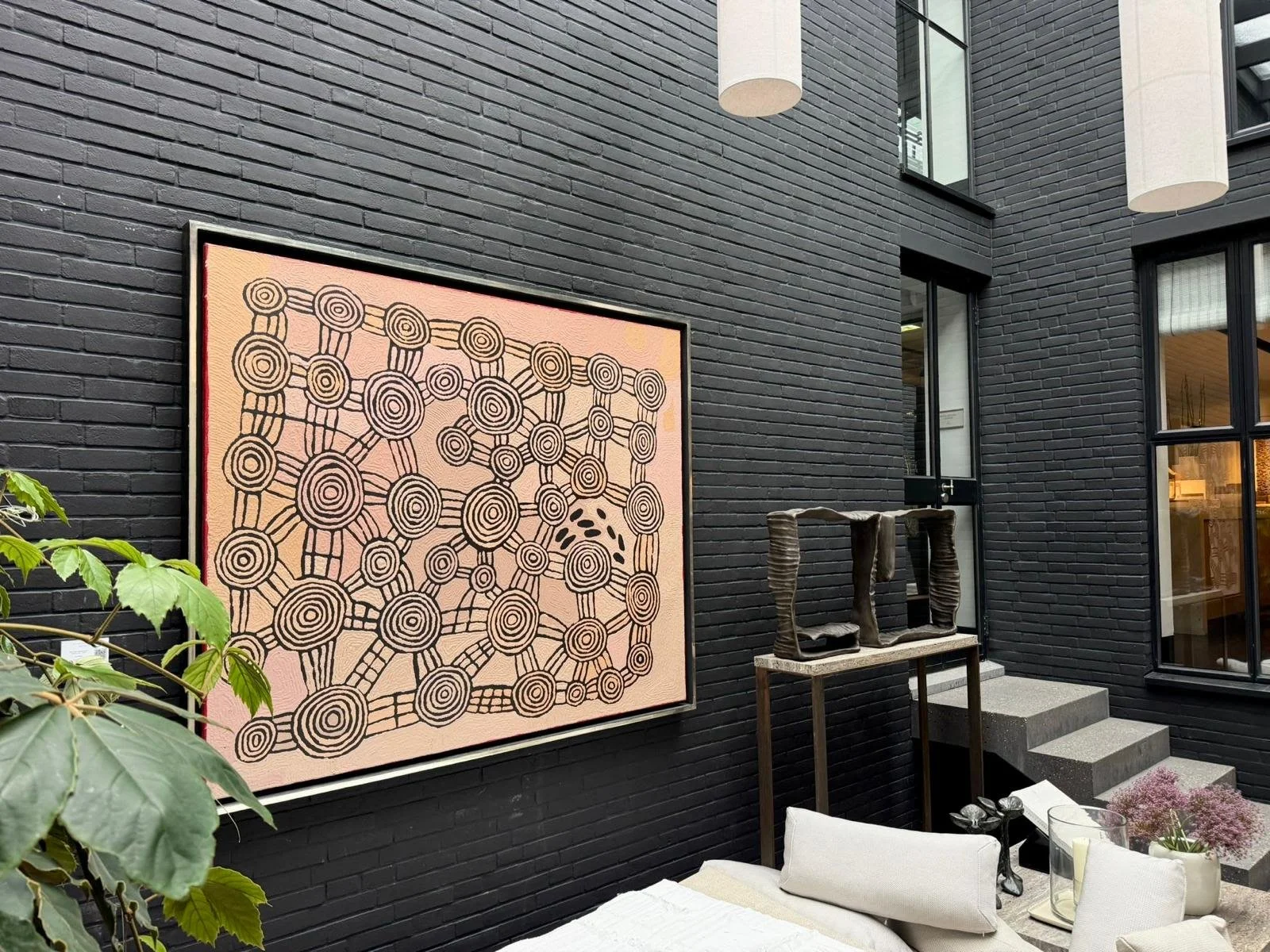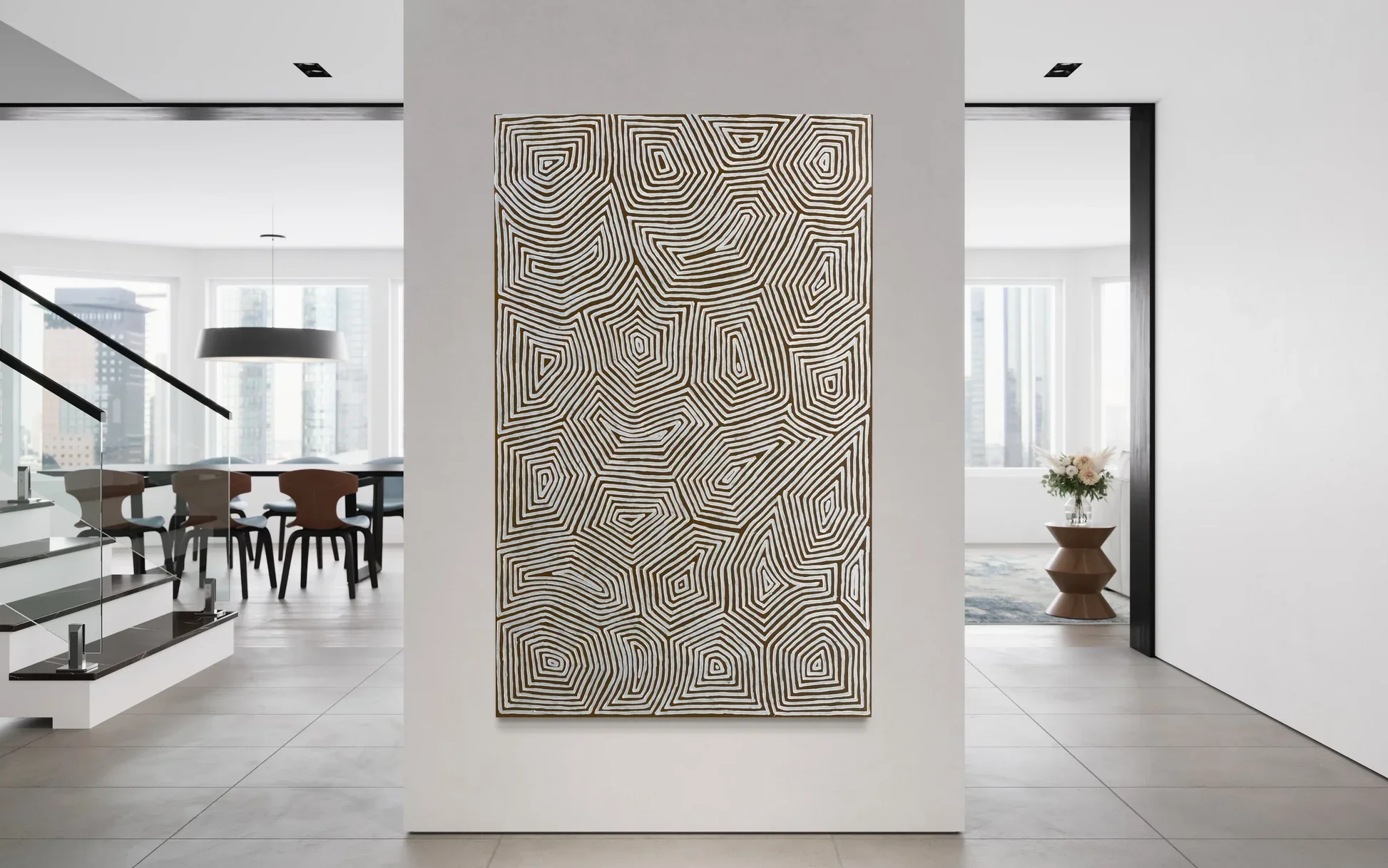 Une œuvre minimaliste de George Hairbrush Tjungurrayi s'intègre parfaitement dans un intérieur contemporain - Son style épuré dialogue avec l'architecture moderne - Conseil décoration Inma Galerie
