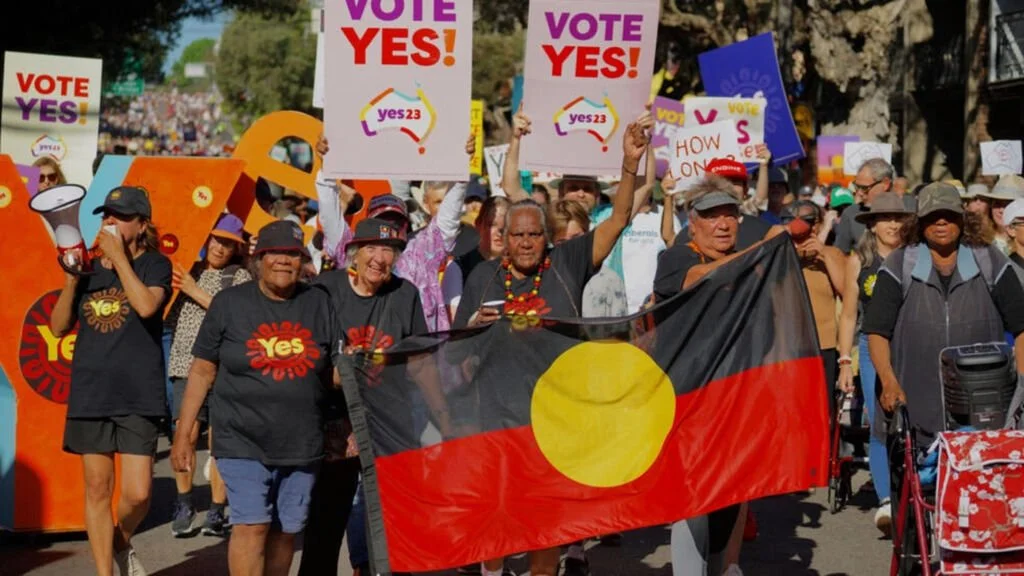 L’art aborigène, un outil de revendication culturelle et politique. Des centaines de manifestants dans les rues de Sydney en soutien à la réforme sur le droit des Aborigènes, en septembre 2024.