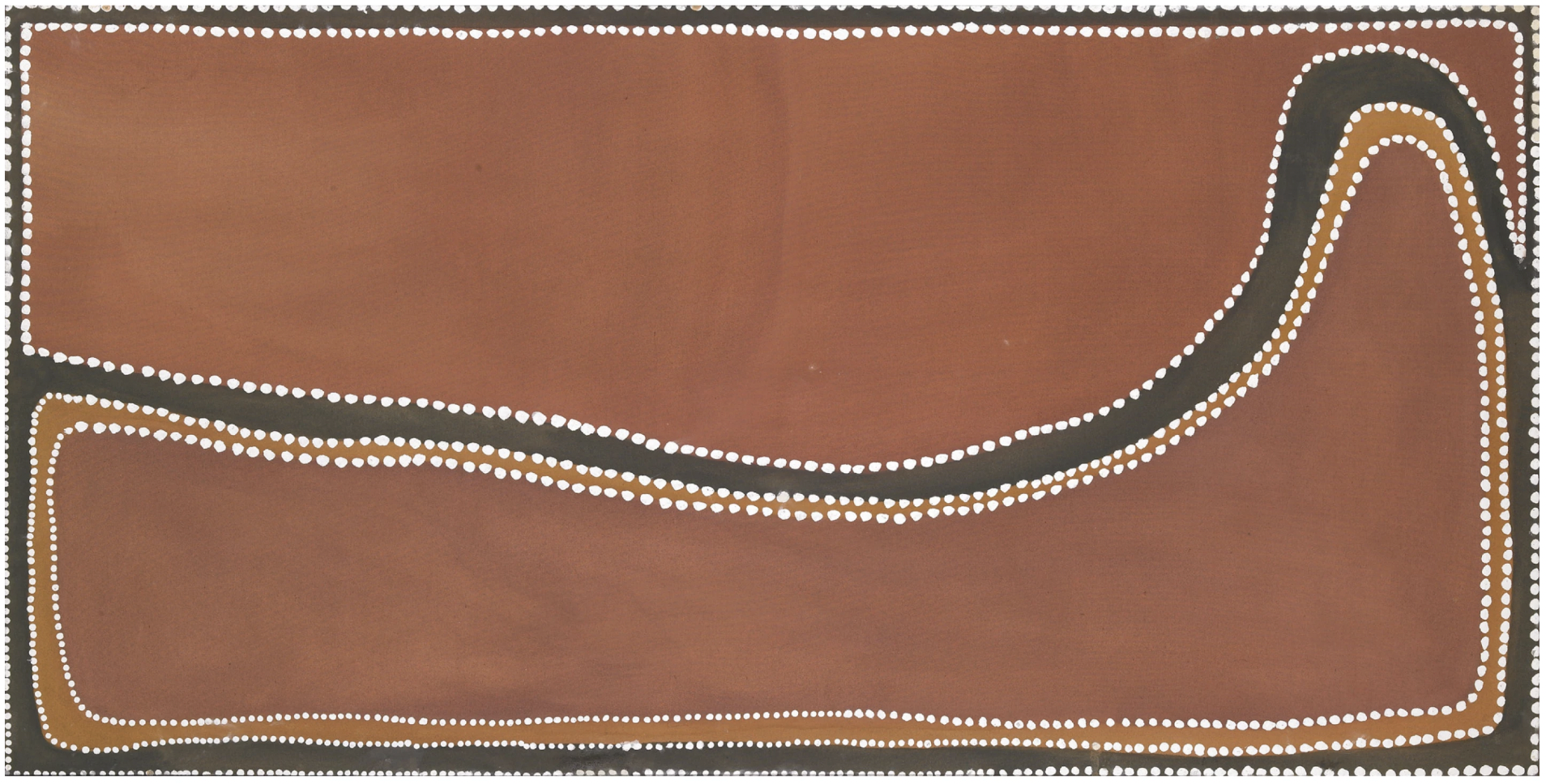 Lignes sinueuses : représentant les chemins ancestraux (songlines) qui traversent le territoire.