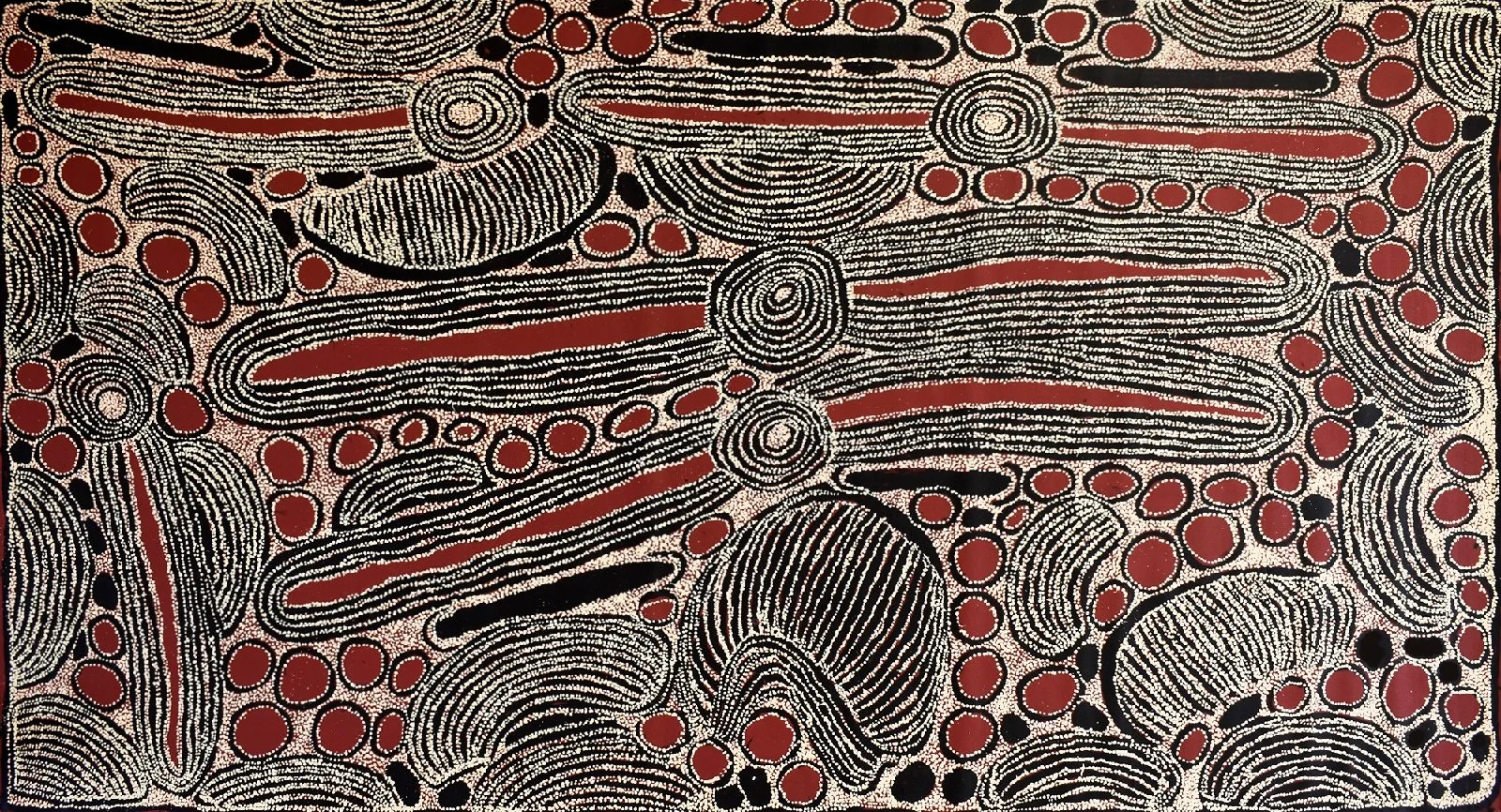 Avec connaissance basique, spectateur identifie que cercles représentent sites sacrés réels, que lignes cartographient itinéraires ancestraux, que composition constitue carte spirituelle du territoire, et que œuvre documente géographie Pintupi.
